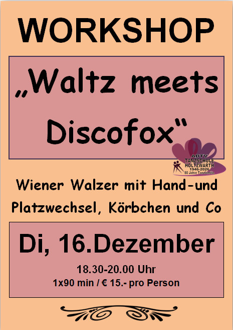 In Workshops unterrichten wir Specials wie Discofox, Salsa, Bachata, Cha Cha Cha Latino Style, Nightclub Two Step und Tango Smooth.