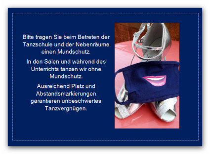 - Beim Betreten der Tanzschule und im Vorraum bitte einen Mundschutz (medizinisch oder FFP2) tragen und die Hände desinfizieren.