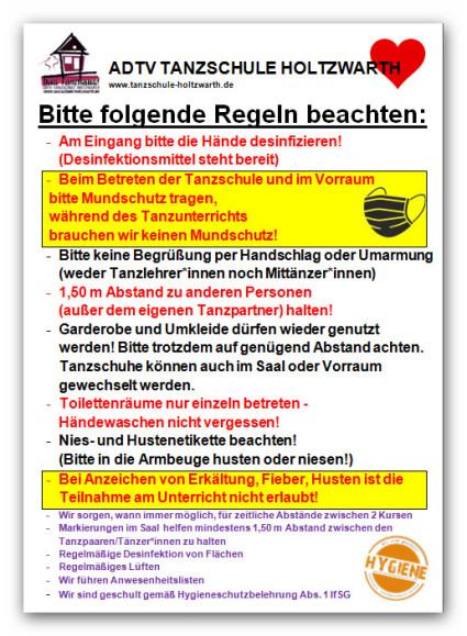 - Unabhängig vom Inzidenzwert bleiben wir in der Tanzschule bei unserem bewährten Hygienekonzept: